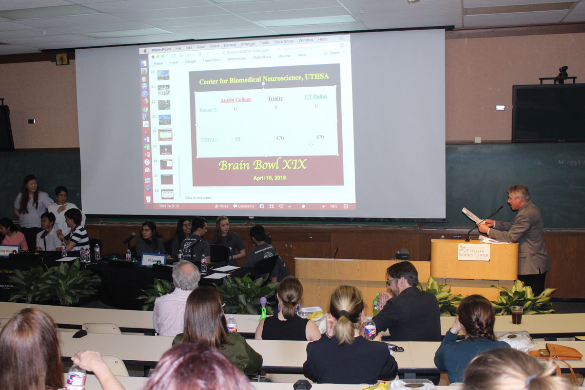 After “flexing their axons and straining their synapses (during the initial three rounds),” said Morilak, both teams from Trinity University and UT Dallas entered the challenge round with 470 points. However, since both teams decided to wager zero points during this round, they were tied at the conclusion of the competition. To determine the 19thAnnual Brain Bowl champions, both teams entered a tiebreaker round, where the team that answered the most out of five questions would take home the trophy. After answering three questions correctly, it was the Trinity tigers who won, beating last year’s Brain Bowl champions from UT Dallas.